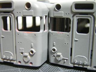 タイフォン加工 ・キハ65-1711(左)、キハ65-711(右) キハ65-711号は種車に寒冷地用500番台(516号)が使用 されています。 大きな外観上の違いとして、タイフォンがシャッター式である事が 挙げられますのでパーツを交換します。 元のモールドを削り、エコーの気動車/寒冷地型タイフォン (No.1624)を実装します。 併せてワイパーもエッチングパーツに交換する為、ワイパー穴を 一旦プラ引延し棒で埋めています。 '05-7-17 |