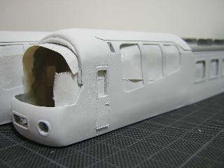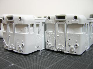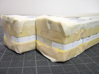 ・キハ65-1701(手前)/701(奥) 室内を軽く塗装後、まず白から行います。 塗料はGM37(白3号)です。 >内装はGM21(小田急アイボリー)にGM4(国鉄クリーム4)を 混ぜて、黄見を出しています。 |