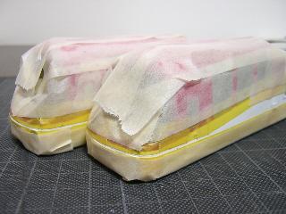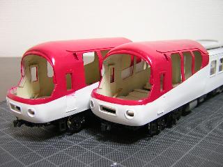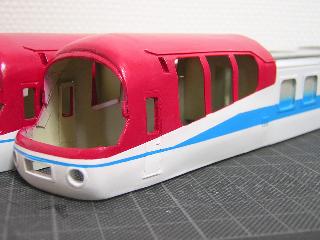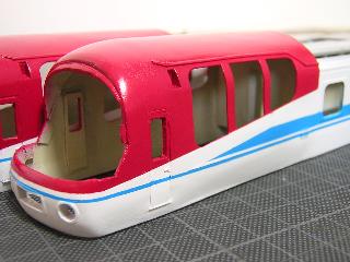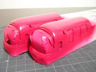 ・併せて、赤も塗り替えました。 これは赤が明るすぎた以上に、アクリル塗料の為か、乾燥しても 粘性を持った感じで、車両ケースの凸の跡がついてしまう為です。 そのため、ラッカー系の塗料で調合しました。 GC3(赤)にGC67(紫)とGM29(京急バーミリオン)を少しづつ混ぜて、 紫を出していきます。 |
