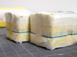 ・キハ65-1701(左)/701(右) 次に青ラインを吹くため、マスキングを行います。 青ラインの間にある、細い白線は後で吹きつけを行う為、 今回は無視します。 |