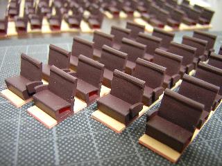 ・座席部の床はCFシートらしき物が敷かれていたので、GM4 (国鉄クリーム4号)を。座席をGM2(国鉄ぶどう2号)を使用 しています。 座席はこの後、枕カバーを貼り付ける予定です。>組立編 なお座席はKTMのプラ椅子シングルを使用しています。 実車とは形状が異なりますが、安価なのが魅力です。 '05-8/7 |