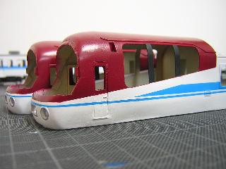 ・キハ65-1711(左)/711(右) まず、展望室周りの赤から吹きました。 GSIクレオスの水性ホビーカラー(H43:ワインレッド)を使用 しました。 ★塗装に関しては、後で修正しました。 |