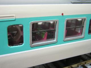 | ・クハ111-7706 更新車の窓枠は、プラ板から切り出して作成しています。 窓ガラスは、オリジナルの窓を使用していますが、2段サッシ表現の 為、下段が奥に引っ込んでいます。 実車はフラットに近い為、後日構成を見直し予定です。 戸袋窓は、ドア開閉スイッチが設けられている為、サイズが小さく なっています。 併せて1.5mmほど幅をつめています。 |
