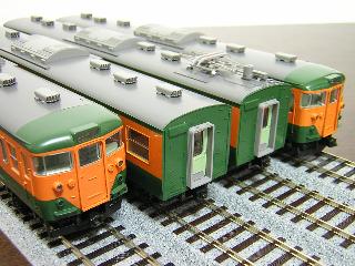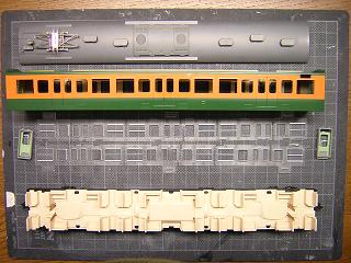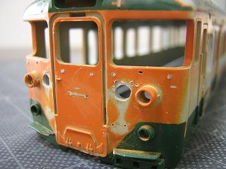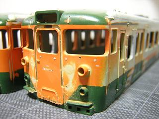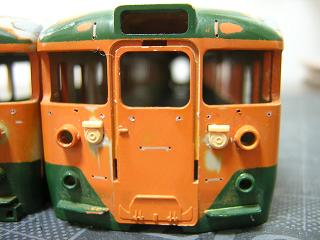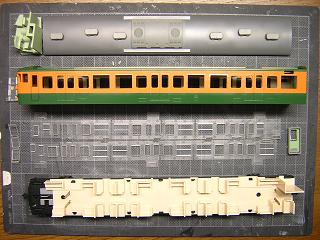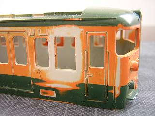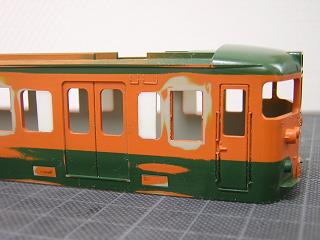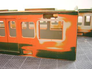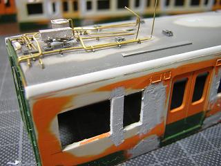 | 加工状態確認(モハ113-5719) 先頭車同様、下地塗料にGM9(ねずみ1号)を吹いています。 |