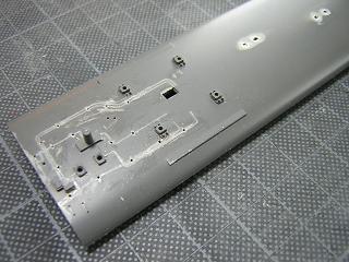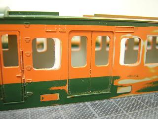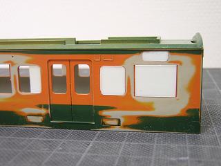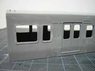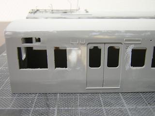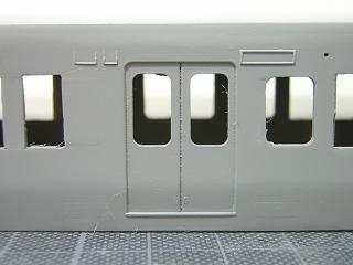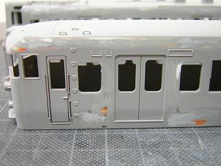 | 側面加工(モハ113-5719) 窓、およびドア点検周辺の処理を確認します。 400番ぐらいの耐水ペーパーで表面を平滑にしていきます。 |