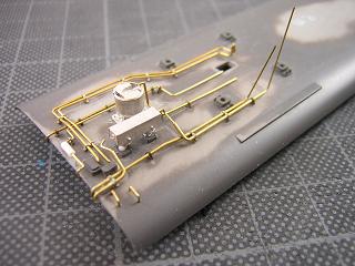| モハ112-5719 屋根上配管実装(既設側パンタ周辺) 今回、先に屋根上配管を実装しました。 これは、実車が更新工事により、雨樋が側板と一体になって いることから、模型では屋根板と車体を接着して雨樋周辺加工 を行う予定のためです。 なお配管はマッハの配管止めを使用しています。 |