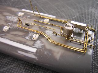 | モハ112-5719屋根上配管 母線関係はφ0.5mmのパイプにφ0.3mmの真鍮線を 通したもの、その他はφ0.4mmの真鍮線を用いています。 |