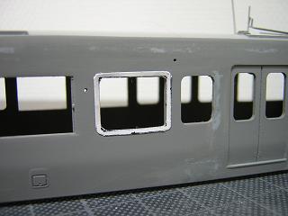 | 状態確認4(クハ111-7756) 窓枠表面や切断面を仕上げ、軽くGM9(ねずみ1号)を吹いた 状態。 さらにパテで段差など修正しています。 (何度やっているのやら...) しかし、少々窓枠が太すぎた様な感じです...。 |