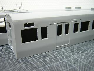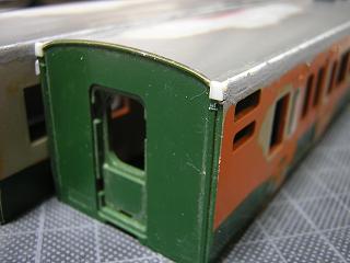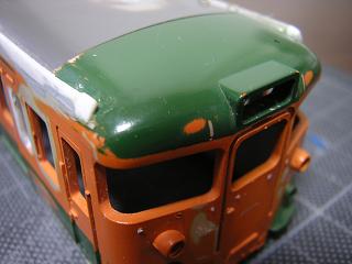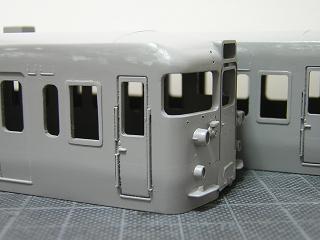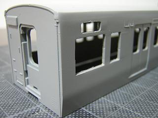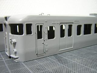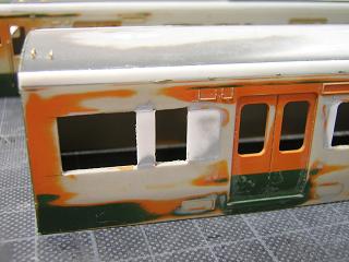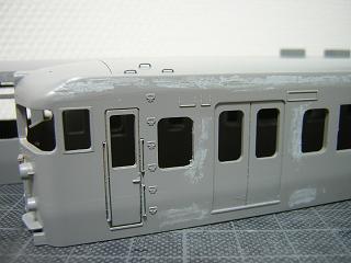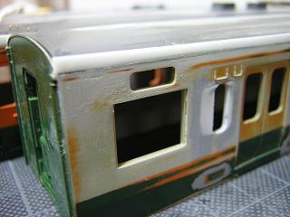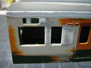 | 加工状態確認(クハ111-7756) 雨樋接合部や、ドア点検窓。窓埋部が均一でない為、 再度耐水ペーパ等で平滑処理を行います。 |