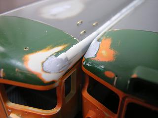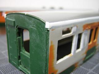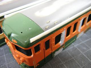 | 雨樋加工(モハ113-5719) 側板側雨樋と妻面側雨樋で段差が無くなる様に、整形 していきます。 タミヤのパテと、瞬間接着剤を併用しています。 なお写真は側面側雨樋は、パテを削った状態。 仕上がりを確認しながら、パテ盛り、削りを繰り返して いきます。 |