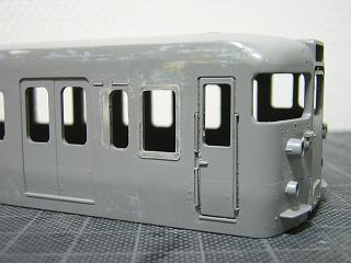 | 加工状態確認(クハ111-7706) 加工状態を確認する為、下地塗料としてGM9(ねずみ1号) 吹きます。 |