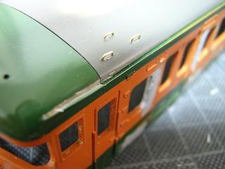 | 屋根上雨樋加工(クハ111-7706) 旧雨樋はやすりでザックリと削った後、耐水ペーパーで 段差を無くして行きます。 最終的にはパテを使用し、平滑になるように処置する つもりです。 現状イマイチな仕上がりです。 本当にそれらしくなるのか、ちと不安です^^;) |