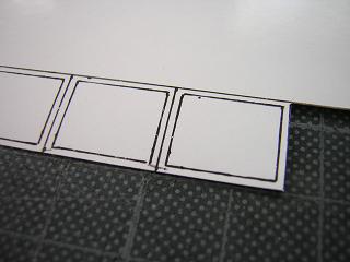 | 窓枠作成1(モハ112-5719) プリンタ用シールで試作した窓枠を貼付け。 シールということを利用して、貼付けの手間削減を狙い ましたが、やはりインパクトにかけるようです...。 ということで、素材の見直し。 |