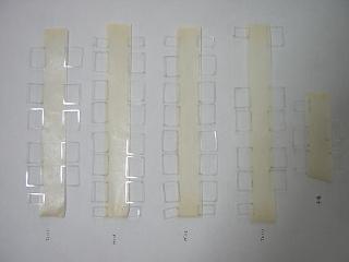| 窓枠作成1 今回の難関である更新車窓枠。 実車は見た目すっきりとしていますが、は窓枠だけでなく ガラス押さえ?など、結構立体的な構造となっています。 しかし、模型でそこまで作り込むのは困難な為、ひとまず 窓枠だけ表現することにします。 実物でも厚さ5mm程度。1/80に縮小すると厚さは0.1mm弱。 よって、プリンタ用シール用紙で窓枠を試作してみました。 |