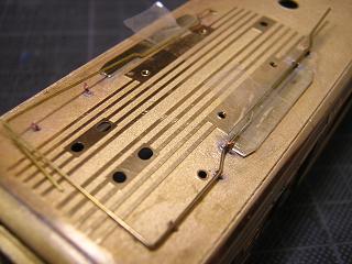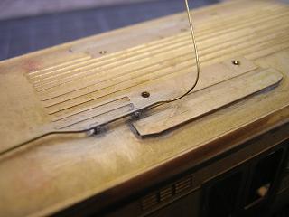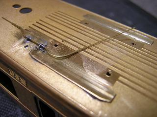 乗務員ドアの手摺をキット付属の真鍮線(φ0.4mm)から作ります。 |