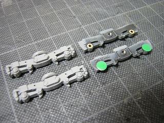 | ・床下塗装 台車も同様に灰色1号を吹いています。 車軸等電気的接合箇所には塗料がつかないようにマスキングを しておきます。 当方は市販事務用品の●シールを使用しています。 |