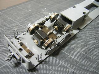 | ・床下組立 台車は写真のようになります。 配線は、室内灯、前照灯含めるとかなりの配線数となりますので、 以下に少なくするか検討要です。 よって、今回は仮組立てにとどめておきます。 |