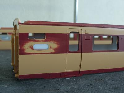 車体塗装 ・まずはアイボリーを吹きます。 アイボリーはGM37:白3号をベースに、GSIクレオスNo.22: ダークアースとGSIクレオスNo.3:赤を調合しています。 実車よりやや明るめですが、先に製作したT44編成に 合わせています。 |