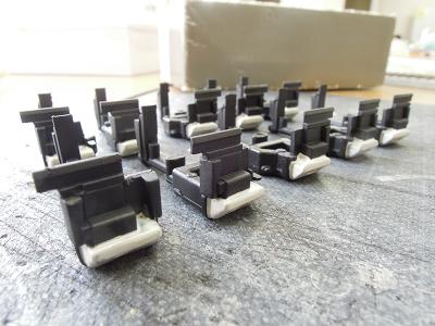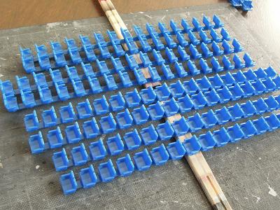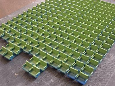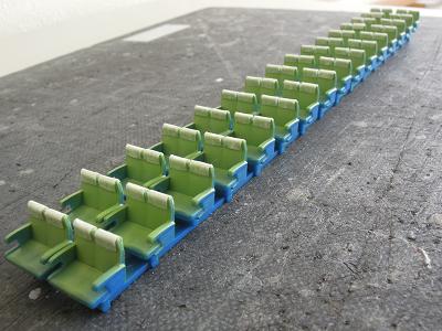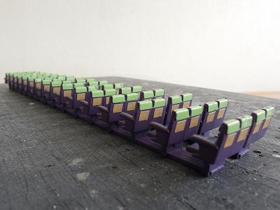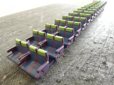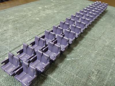 座席塗装 ・再び平日のマスキングタイム。 紫の塗装に備え、地道な作業が進みます。 しかし数多すぎ...。 ちなみに手前のシートはクロハ用で、グリーン室シートの実現 方法が未検討の為、とりあえず塗装だけ紫系の単色として おきます。 |