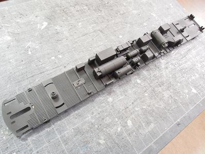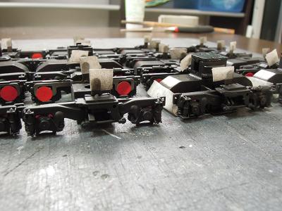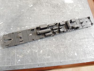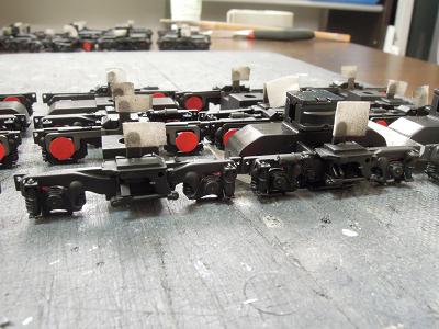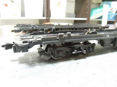床下塗装 ・台車の塗装完了 下地にGSIクレオスNo.B-504:のメタルプライマーを 吹いた後、艶消し黒を吹いています。 |