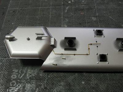 クハ183-205アンテナ配管実装 ・配管類の実装。 この後の塗装に備えて、GSIクレオスのB-504:メタル プライマーを吹いておきます。 |