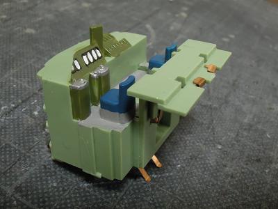 運転台ユニット塗装 ・運転台ユニットを取り外したついでに、運転台に色指しをして おきます。 運転台にはGSIクレオスNo.303:グリーンFS34102、 シートはGM22:小田急ブルーを、マスコン類には GSIクレオスNo.8:銀を、メーターにはGM37:白3号、 床にはGM9:ねずみ1号を色差ししています。 |