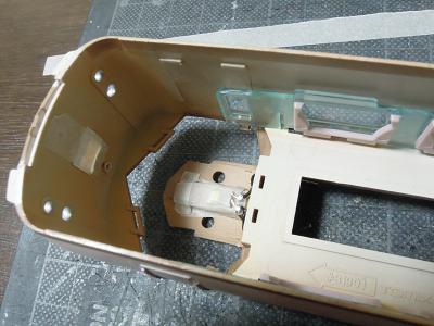 内装組立 ・運転席のライトユニット実装。 両面テープで接着した後、光を拡散させる為,トレーシング ペーパーを被せておきます。 |