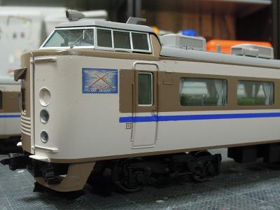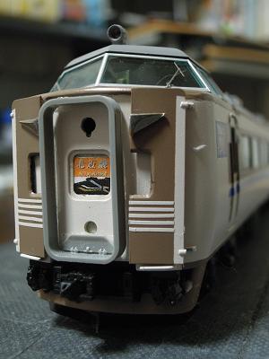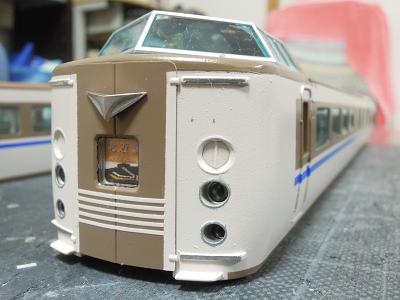 車体塗装 ・クハ前面の帯は、アイボリー塗装したデカールを切り出して 貼付けています。 その後、愛称幕のHゴムに色差ししておきます。 また特急シンボルマークも銀色化のため、GSIクレオスの No.211:クロームシルバーを色差しして、後で磨きだします。 2012-8/22 |