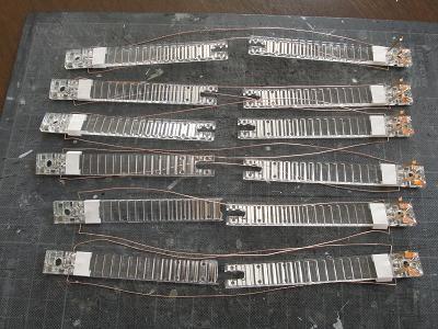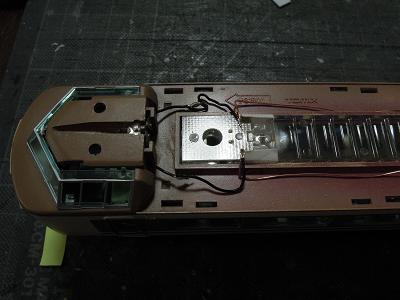 室内灯加工 ・運転会も無事終わり、工事再開。 室内灯をユニットを接続し、床板からの集電箇所を 1箇所にし、加えてトイレ側で集電することで、客席から 集電端子を見えなくします。 併せて表示幕点灯化工事も施します。 |