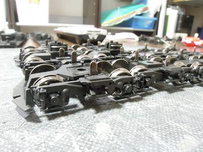 床下塗装 ・床下に関しては標準工事として台車を含め全て艶消し黒を 吹きます。 台車は一旦ばらして塗装に備えます。 なおこれらの作業はG64編成製作時に同時に行っています。 |