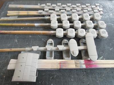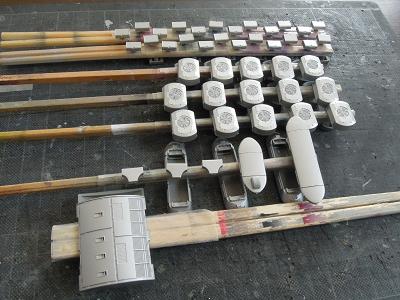 屋根上機器類塗装 ・クーラーやベンチレータ類も塗装に備え、一旦メタル プライマーをひと吹きしておきます。 先行落成したG64編成と同時作業です。 |