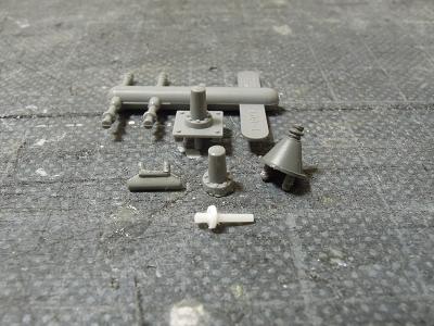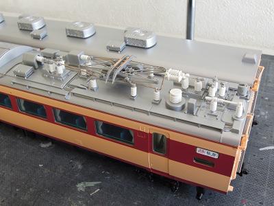 車体組立4 ・屋根上パーツが揃ったので最終工程へ。 検電アンテナ台座はTOMIXの455系用を、その他JRアンテナと 信号炎管はKATOのキハ58用を、汽笛はTOMIXの115系用を 使用しています。 電話用?アンテナ(手前の白いパーツ)はプラ引き伸ばし棒から 自作しています。 |
