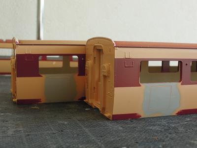 車体塗装 ・まずはアイボリーを吹きます。 アイボリーはGM37:白3号をベースに、GSIクレオスNo.22: ダークアースとGSIクレオスNo.3:赤を調合しています。 実車よりやや明るめですが、先に製作したT44編成に 合わせています。 |
