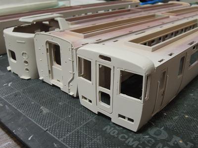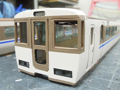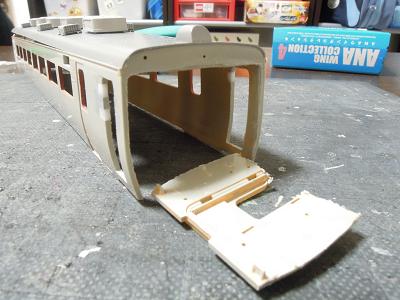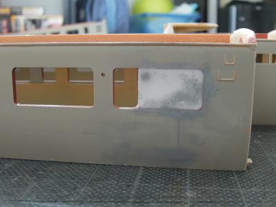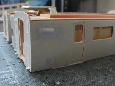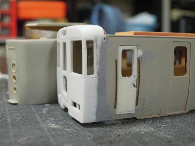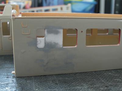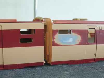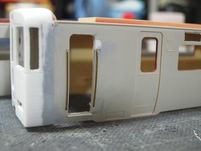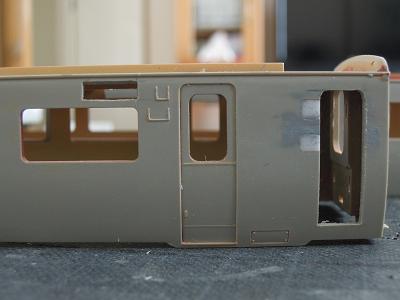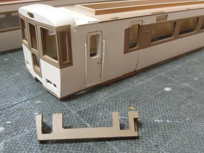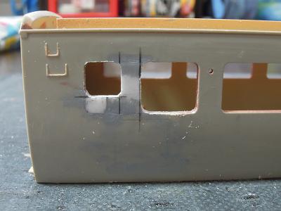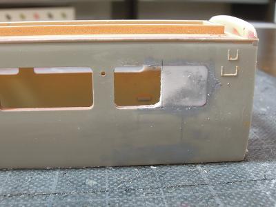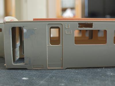 車体加工 ・客室端の反対側はややこしい窓配置になっています。 同様にプラ板で幅を詰めています。 |