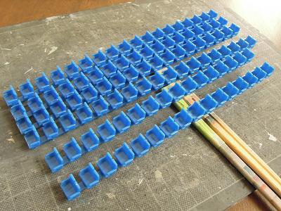 座席塗装 ・普通車の座席背面にはテーブルが設けられています。 表現には、GSIクレオスNo.19:サンディブラウンを吹いた マスキングテープを3.0mm×2.5mmに切り出して、一つ一つ 貼り付けていきます。 こちらも当然ながら平日作業。 |
