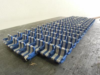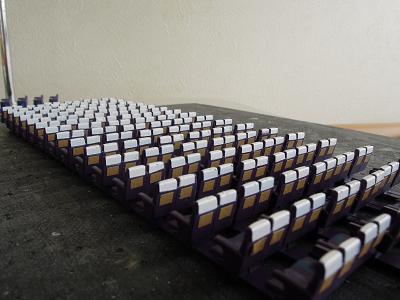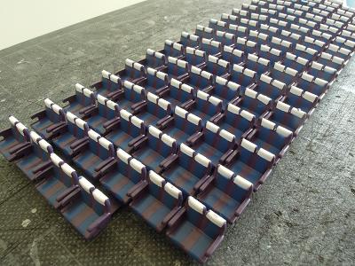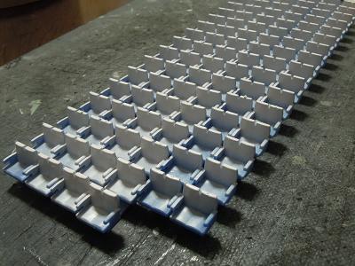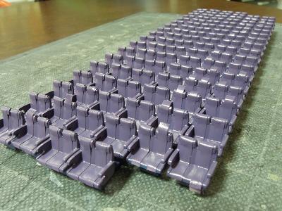座席塗装 ・再び平日のマスキングタイム。 紫の塗装に備え、地道な作業が進みます。 しかし数多すぎ...。 ちなみに手前のシートはクロハ用で、グリーン室シートの 実現方法が未検討の為、とりあえず塗装だけ紫系の単色 としておきます。 |