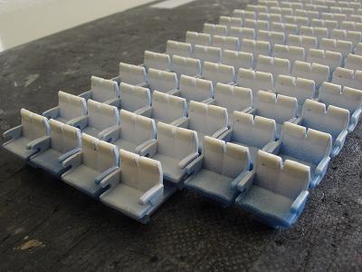 座席塗装 ・北近畿ビッグX対応タイプのシートに塗装します。 作業的には先の床下関係や車体加工と平行して行って います。 まずは下地処理としてGSIクレオスNo.B-504:メタル プライマーを吹いています。 |