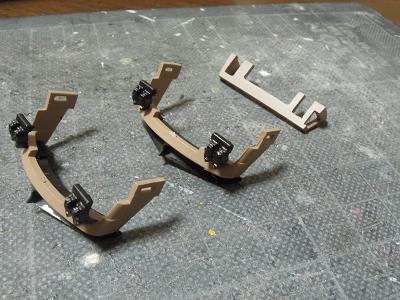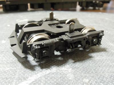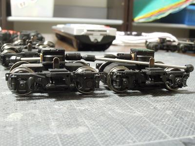 床下塗装 ・台車の塗装完了 下地にGSIクレオスNo.B-504:のメタルプライマーを 吹いた後、艶消し黒を吹いています。 |