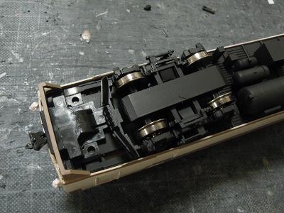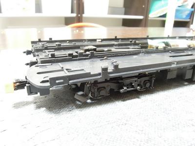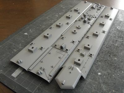 車体組立3 ・スカートおよび連結器の実装状態を裏から。 |