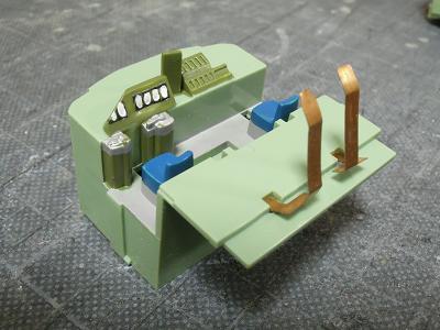 運転台ユニット塗装 ・運転台ユニットを取り外したついでに、運転台に色指しを しておきます。 運転台にはGSIクレオスNo.303:グリーンFS34102、 シートはGM22:小田急ブルーを、マスコン類には GSIクレオスNo.8:銀を、メーターにはGM37:白3号、床には GM9:ねずみ1号を色差ししています。 |