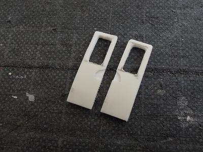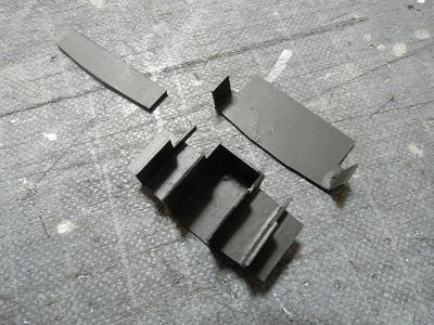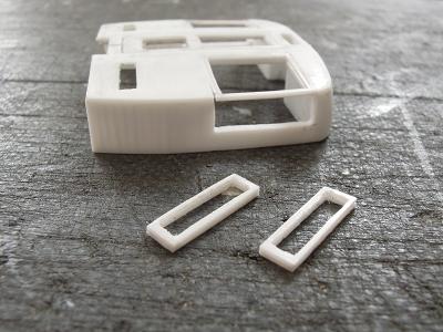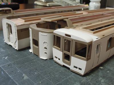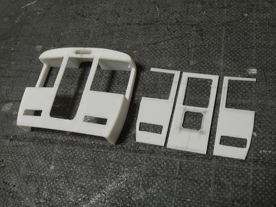 運転台ユニットの製作 ・実車同様に運転台ブロックを製作して車体に取り付けます。 運転台ユニットは、Nゲージの製品から採寸し、t=0.5mmと t=0.2mmのプラ板から製作しています。 |
