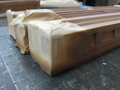 車体塗装 ・前面と雨樋も茶系を吹付けます。 窓周りと一緒に,一気に行いたいところですがマスキングが 面倒なので、別々に作業を行っています。 |