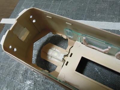 室内灯加工 ・運転席のライトユニット実装。 両面テープで接着した後、光を拡散させる為,トレーシング ペーパーを被せておきます。 |