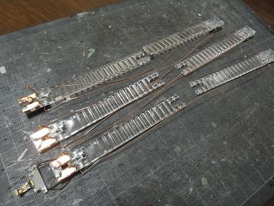 室内灯加工 ・T44編成、G64編成同様に室内灯をユニットを接続し、床板 からの集電箇所を1箇所にし、加えてトイレ側で集電する ことで、客席から集電端子を見えなくします。 併せて表示幕点灯化工事も施します。 手法は「宝塚米谷鉄道」kitkatさまに御教示いただきました ので、弊ページでの詳細な説明は割愛させて頂きます。 |