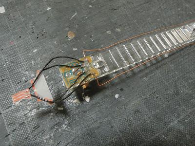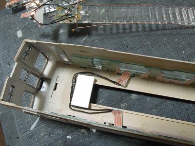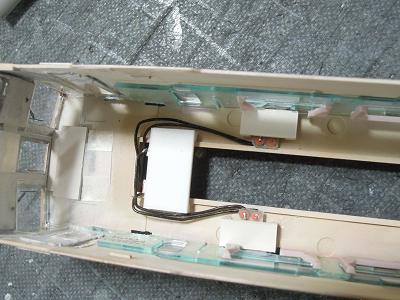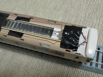 室内灯加工 ・クモハの電装工事カット。 屋根にへばりついているのが、方向幕用ライトユニット。 |