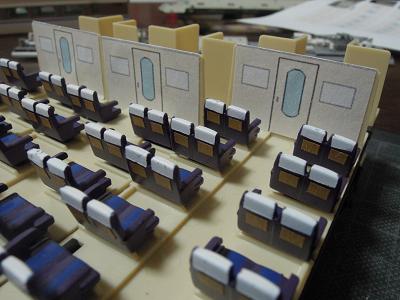 内装組立 ・車内仕切の製作 前作T44編成で使用した車内仕切用のデータ(TRCの701D さま製作)を用いてプリントアウト→仕切り壁に貼付けます。 |
