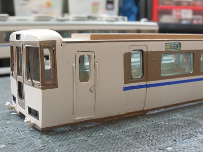 運転台ユニット設置 ・乗務員ドアハンドルをΦ0.3mmの真鍮線で表現しています。 |