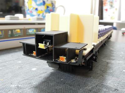 車体組立3 ・スカートおよび連結器の実装。 連結器はとりあえず両面テープで固定しています。 |