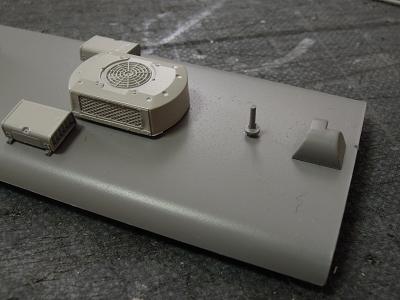 屋根上機器類塗装 ・クーラやベンチレータは明るめのグレーを吹いています。 GMカラーNo.14:灰色9号を使用しています。 |