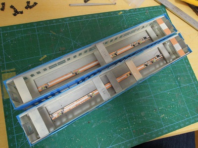 塗装した床下機器類を床板に取り付けます。 |